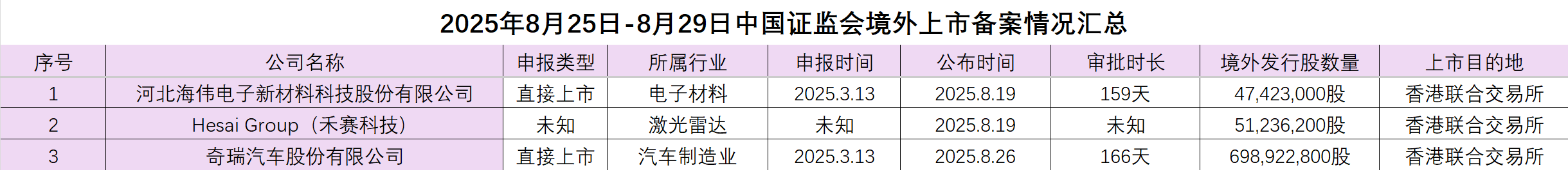截至2025年8月27日,中国证监会最新公布的境外发行上市备案信息显示,本周共有三家企业获中国证监会境外上市备案批准,分别是激光雷达制造商Hesai Group禾赛科技、电子新材料商海伟电子、中国汽车公司奇瑞汽车。三家企业均选择香港联合交易所上市。 激光雷达制造商禾赛科技拟赴港上市 禾赛科技(纳斯达克代码:HSAI)是全球领先的激光雷达研发与制造企业,产品广泛应用于搭载高级辅助驾驶系统(ADAS)的乘商用车,及自动驾驶汽车、配送机器人、移动机器人等领域。公司此前已在纳斯达克 IPO,若此次港股上市顺利落地,公司将正式加入“美+港”双重上市企业阵营。 公司拟发行不超过51,236,200股境外上市普通股并在香港联合交易所上市。 |
