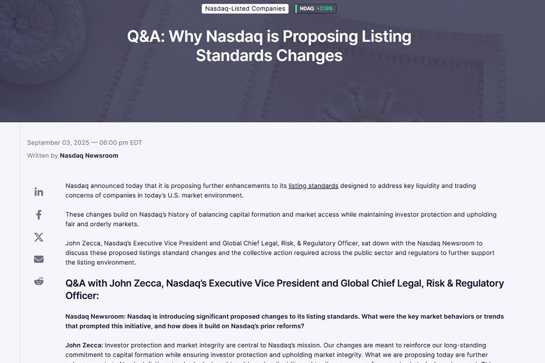 2025年9月4日,纳斯达克交易所宣布已向美国证券交易委员会(SEC)提交拟议规则变更,旨在提高小型IPO及中国公司的上市标准,以应对市场流动性不足和潜在交易风险。此次调整聚焦三大核心改革: 提高最低公众持股市值要求 根据净收入标准,新上市公司的最低公众持股市值从500万美元提升至1500万美元。 加速低市值公司退市流程 针对上市合规缺陷且市值持续低于500万美元的公司,简化暂停交易和退市程序。 中国公司IPO募资门槛显著提升 针对主要在中国(含香港特别行政区)运营的新上市公司,其首次公开募股的最低募集资金要求为2500万美元。 通过提升IPO发行与募资门槛及公众持股要求,吸引更具规模优势和更高质量的企业上市;同时,通过优化低市值公司的退市机制,加速市场出清,进一步提升资源配置效率,促进资本市场整体质量的提升。 芒果金融凭借过往经验判断,本次纳斯达克拟议的新规尚需约4至5个月方能正式实施。对于中国大陆及香港的中小企业而言,2500万美元的IPO融资门槛几乎难以逾越。在此背景下,通过SPAC被并购或者先于OTC挂牌再择机转板的方式登陆美股市场,将成为更为务实且可行的替代方案。 |