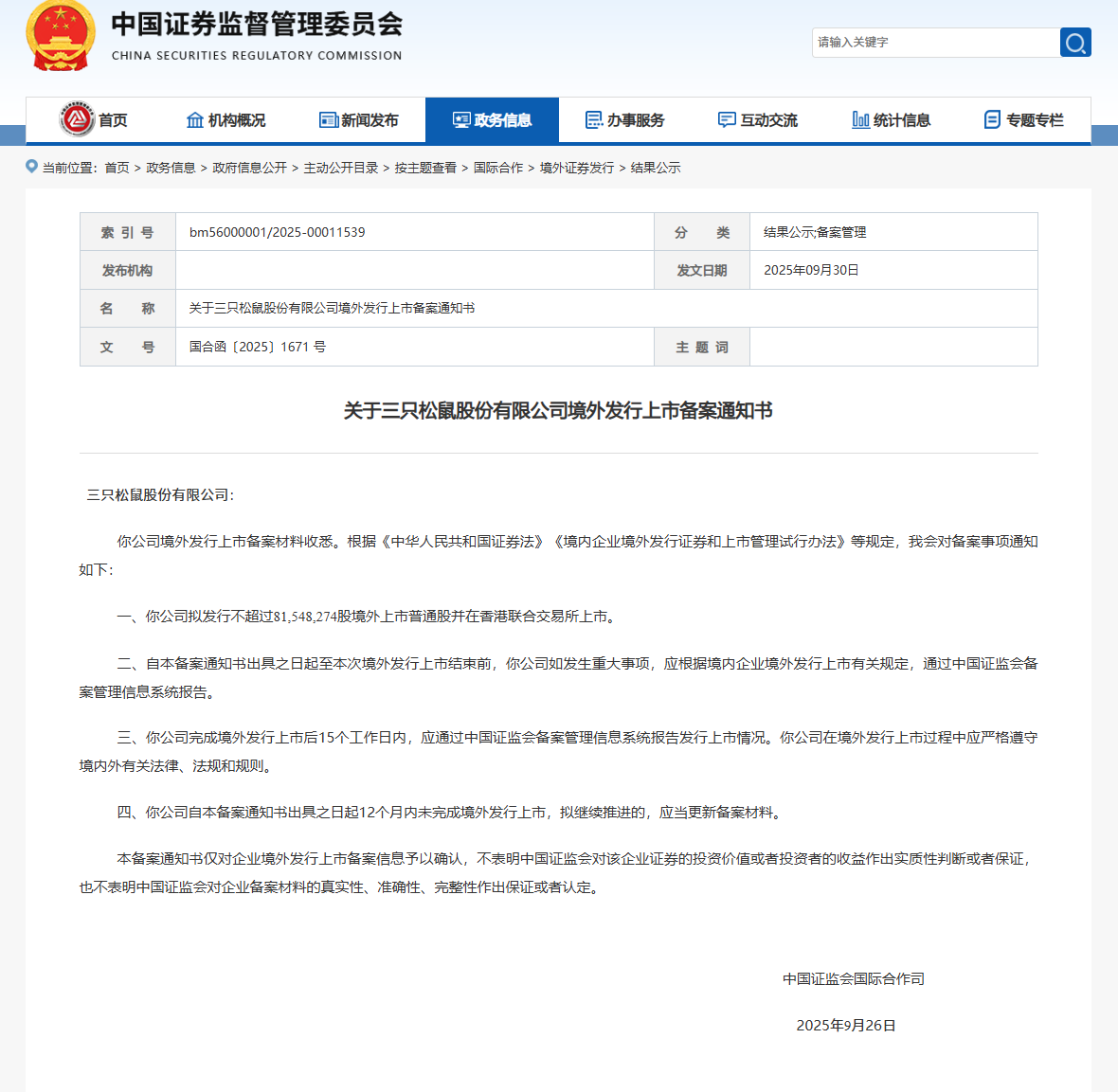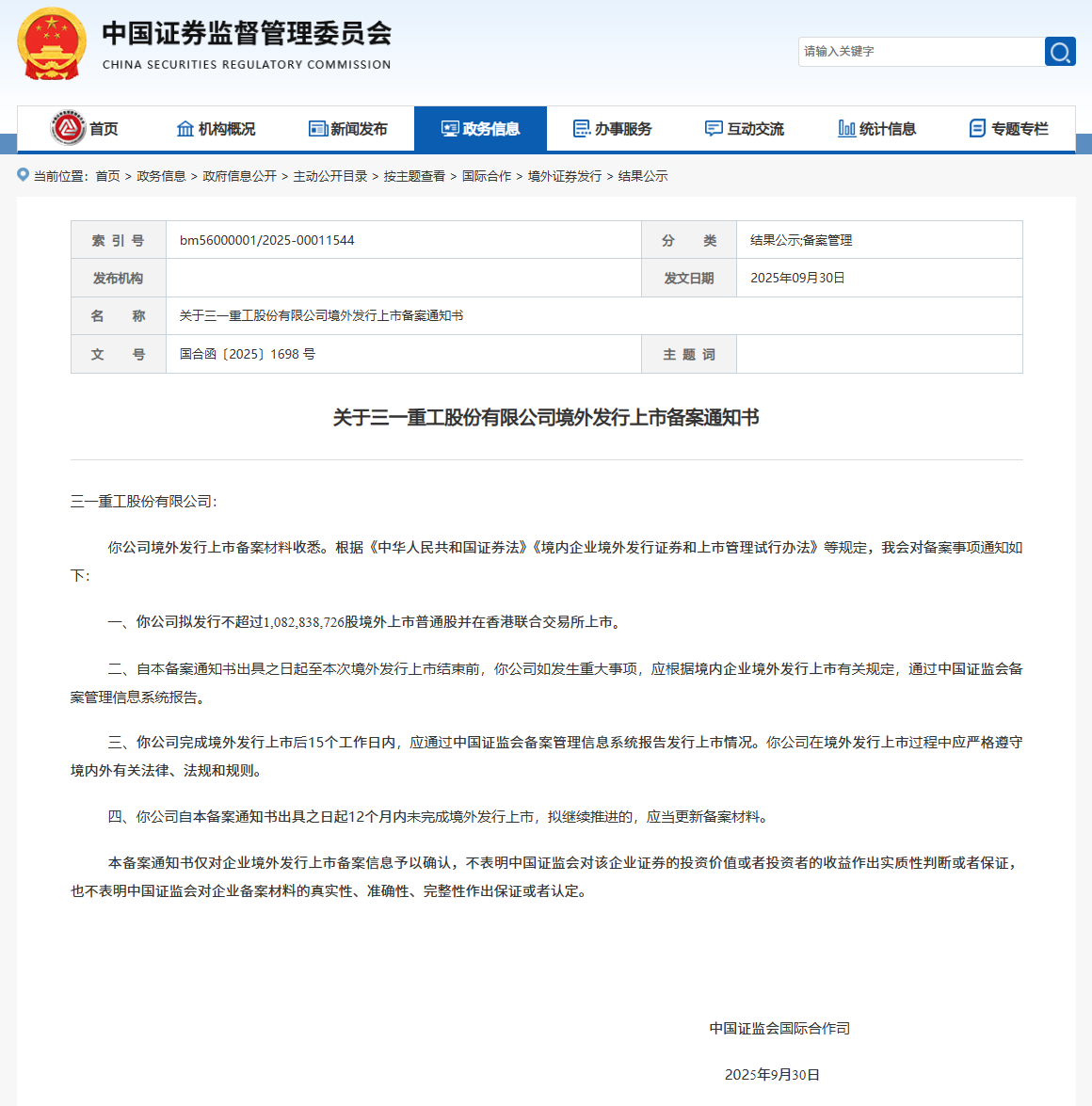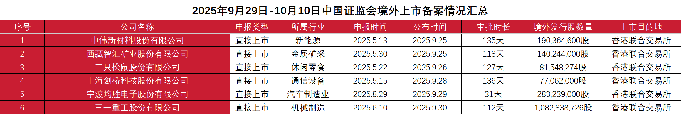 截至2025年10月10日,中国证监会最新公布的境外发行上市备案信息显示,近两周共有六家企业获中国证监会境外上市备案批准,分别是中伟新材料股份有限公司、西藏智汇矿业股份有限公司、三只松鼠股份有限公司、上海剑桥科技股份有限公司、宁波均胜电子股份有限公司、三一重工股份有限公司。 其中5家企业均为A股上市公司,包含多家行业领先、品牌影响力突出的优质企业,纷纷选择登陆港股市场,进一步彰显了港股市场的活跃氛围与持续吸引力。 千亿工程机械企业三一重工 三一集团是中国首家“破千亿”的工程及机械企业,主业是装备制造业,主导产品为混凝土机械、挖掘机械、起重机械、筑路机械、桩工机械等全系列产品。 公司拟发行不超过1,082,838,726股境外上市普通股并在香港联合交易所上市。 国民零食第一股三只松鼠 三只松鼠(300783.SZ)是一家以坚果及休闲食品研发、销售为主的港澳台投资上市企业。公司主营业务涵盖食品生产、日用品及电子产品零售,构建了覆盖电商平台、线下门店的全渠道营销网络。 公司拟发行不超过81,548,274股境外上市普通股并在香港联合交易所上市。 |