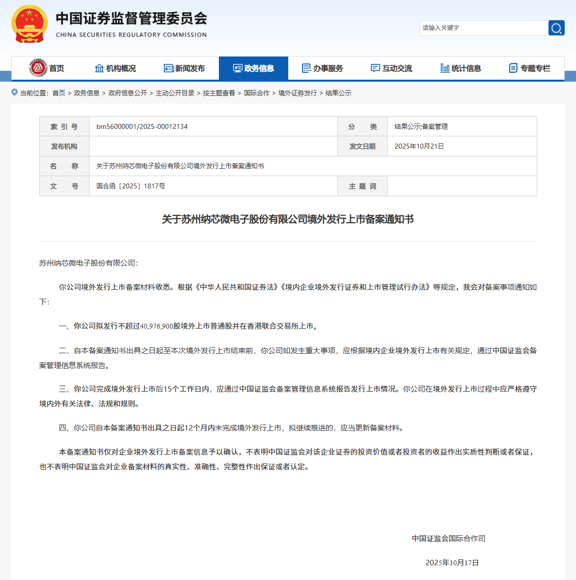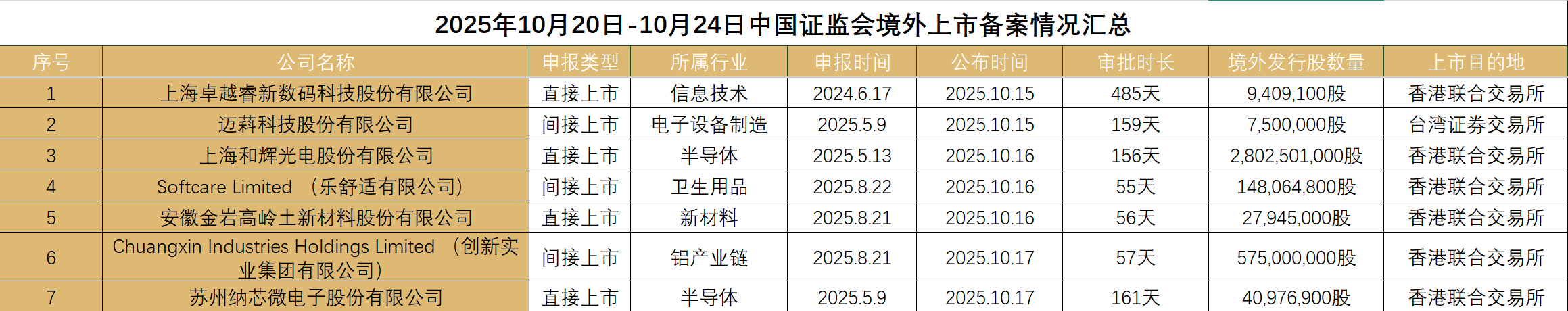 截至2025年10月24日,中国证监会最新公布的境外发行上市备案信息显示,本周共有七家企业获中国证监会境外上市备案批准,分别是上海卓越睿新数码科技股份有限公司、迈萪科技股份有限公司、上海和辉光电股份有限公司、Softcare Limited (乐舒适有限公司)、安徽金岩高岭土新材料股份有限公司、Chuangxin Industries Holdings Limited (创新实业集团有限公司)、苏州纳芯微电子股份有限公司。 其中六家上市目的地为香港联合交易所,一家为台湾证券交易所。