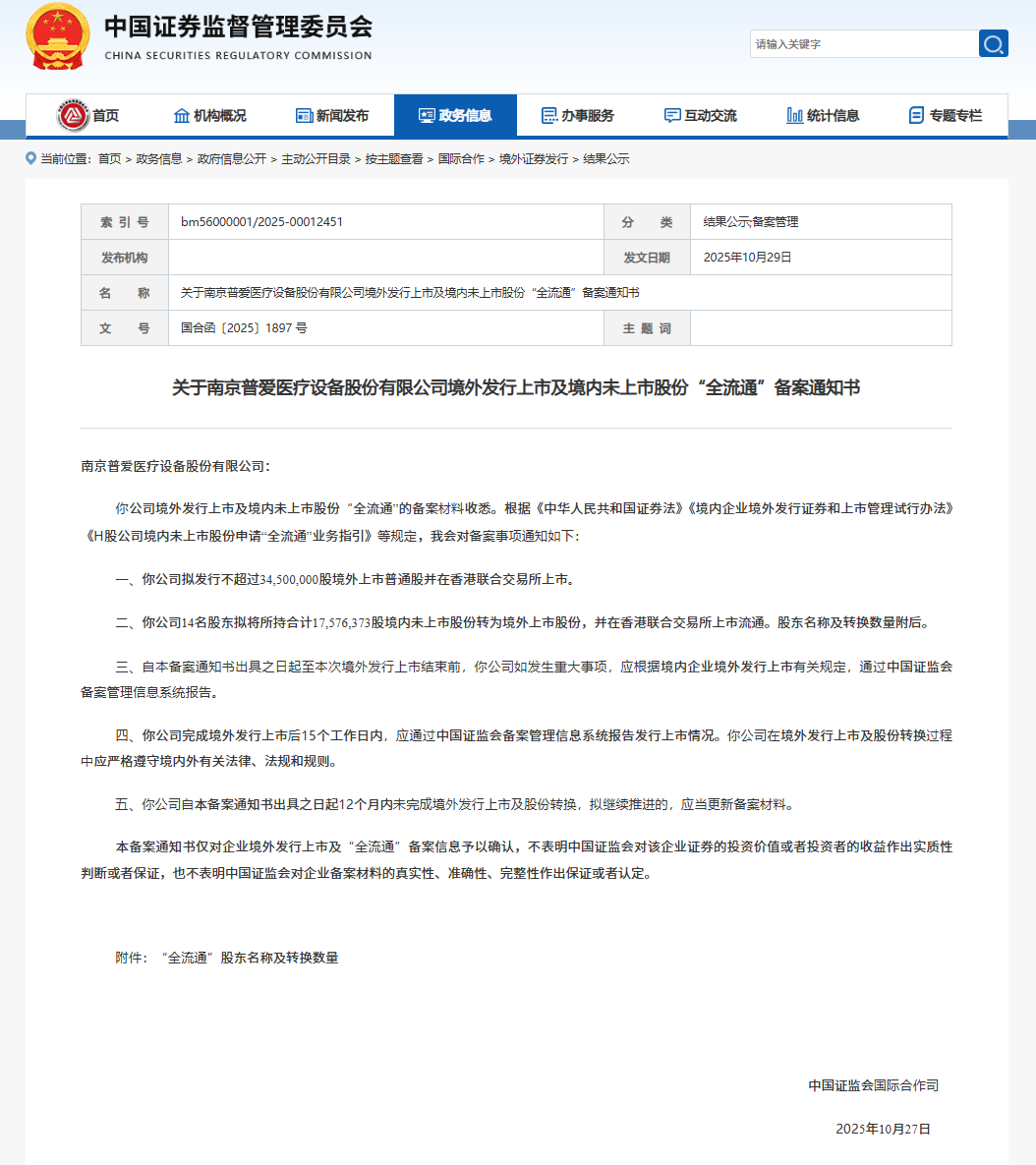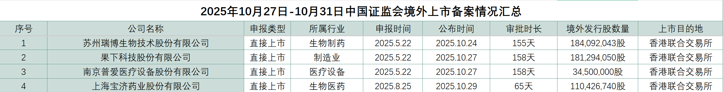 截至2025年10月31日,中国证监会最新公布的境外发行上市备案信息显示,本周共有四家企业获中国证监会境外上市备案批准,分别是苏州瑞博生物技术股份有限公司、果下科技股份有限公司、南京普爱医疗设备股份有限公司、上海宝济药业股份有限公司。四家公司上市目的地皆为香港联合交易所。