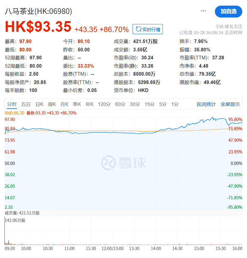 2025年10月28日,高端中国茶品牌八马茶业成功于香港联合交易所主板挂牌上市,每股定价50港元,共发行900万股股份,公开发售阶段获2680.04倍认购。
