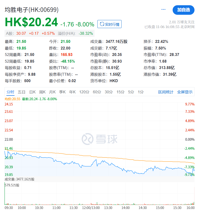 2025年11月6日,均胜电子(600699.SH)于香港联合交易所主板挂牌上市,每股定价22港元,共发行1.55亿股股份,公开发售阶段获147.67倍认购。此前于1993年在上交所上市。