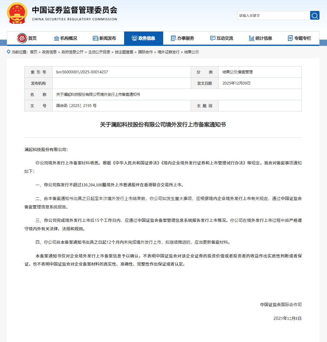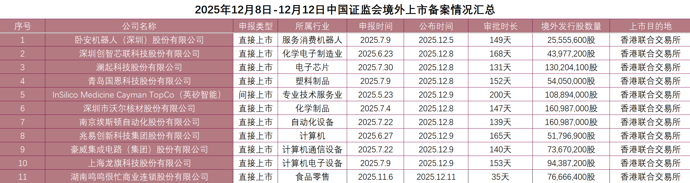 截至2025年12月12日,中国证监会最新公布的境外发行上市备案信息显示,本周共有十一家企业获中国证监会境外上市备案批准,分别是卧安机器人(深圳)股份有限公司、深圳创智芯联科技股份有限公司、澜起科技股份有限公司(688008.SH)、青岛国恩科技股份有限公司(002768.SZ)、InSilico Medicine Cayman TopCo(英矽智能)、深圳市沃尔核材股份有限公司(002130.SZ)、南京埃斯顿自动化股份有限公司(002747.SZ)、兆易创新科技集团股份有限公司(603986.SH)、豪威集成电路(集团)股份有限公司、上海龙旗科技股份有限公司(603341.SH)、湖南鸣鸣很忙商业连锁股份有限公司。 境外上市备案数量继续保持高位,延续企业境外融资需求旺盛的趋势。其中六家企业皆为A股上市企业,若此次赴港上市成功,将实现“A+H”双平台资本布局。