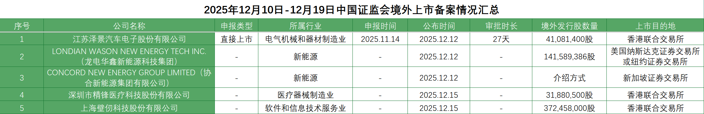 截至2025年12月19日,中国证监会最新公布的境外发行上市备案信息显示,本周共有五家企业获中国证监会境外上市备案批准,分别是江苏泽景汽车电子股份有限公司、LONDIAN WASON NEW ENERGY TECH INC.(龙电华鑫新能源科技集团)、CONCORD NEW ENERGY GROUP LIMITED(协合新能源集团有限公司、00182.HK)、深圳市精锋医疗科技股份有限公司、上海壁仞科技股份有限公司。 其中龙电华鑫新能源科技集团上市目的地为纳斯达克证券交易所或纽交所,协合新能源集团有限公司上市目的地为新加坡证券交易所,其余上市目的地为香港证券交易所。