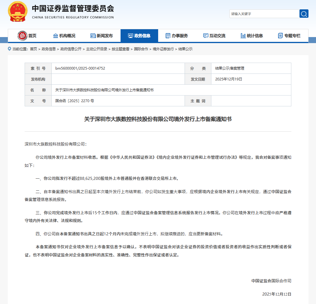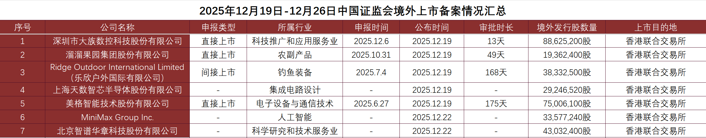 截至2025年12月26日,中国证监会最新公布的境外发行上市备案信息显示,本周共有七家企业获中国证监会境外上市备案批准,分别是深圳市大族数控科技股份有限公司(301200.SZ)、溜溜果园集团股份有限公司、Ridge Outdoor International Limited(乐欣户外国际有限公司)、上海天数智芯半导体股份有限公司、美格智能技术股份有限公司(002881.SZ)、MiniMax Group Inc.、北京智谱华章科技股份有限公司。 其中深圳市大族数控科技股份有限公司和美格智能技术股份有限公司为A股上市企业。