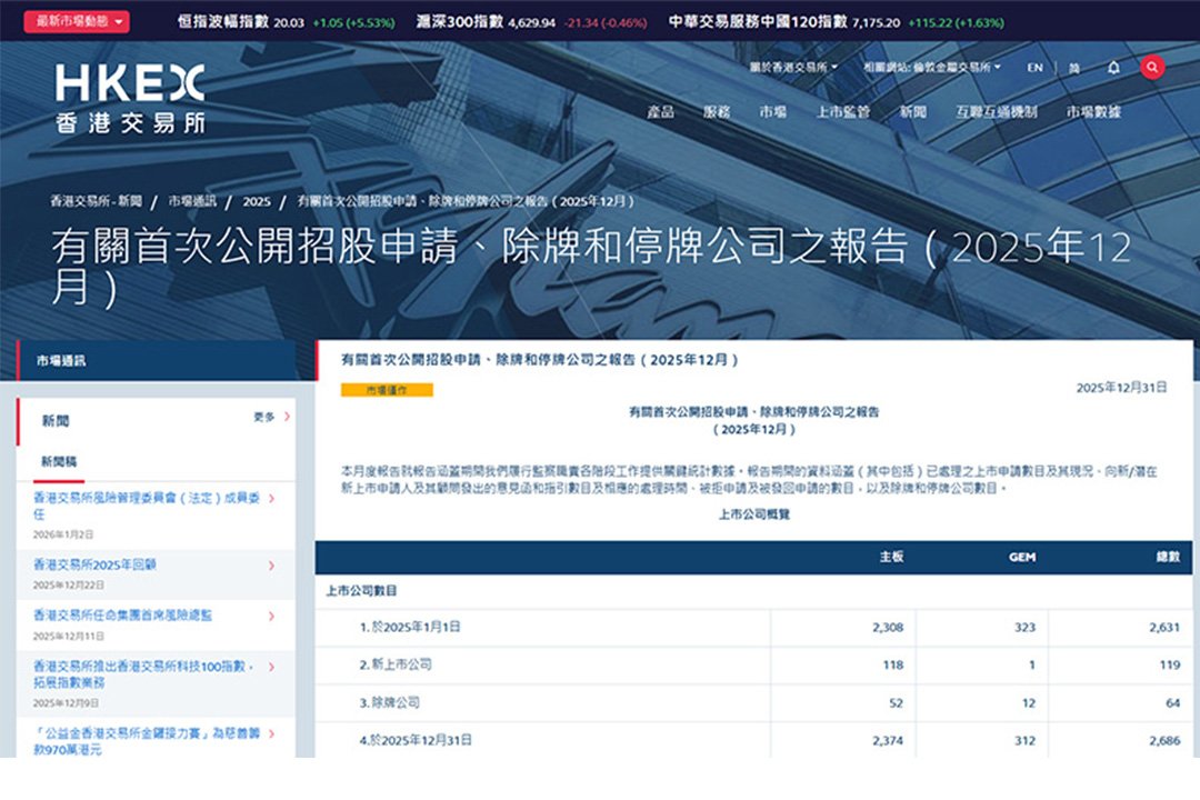 截至2025年12月31日,香港股市呈现显著复苏态势,2025年内共有119家企业成功于联交所挂牌上市,总融资规模达2,857亿港元;这一规模不仅时隔四年再度突破2000亿港元大关,也超越了纽约证券交易所与纳斯达克。