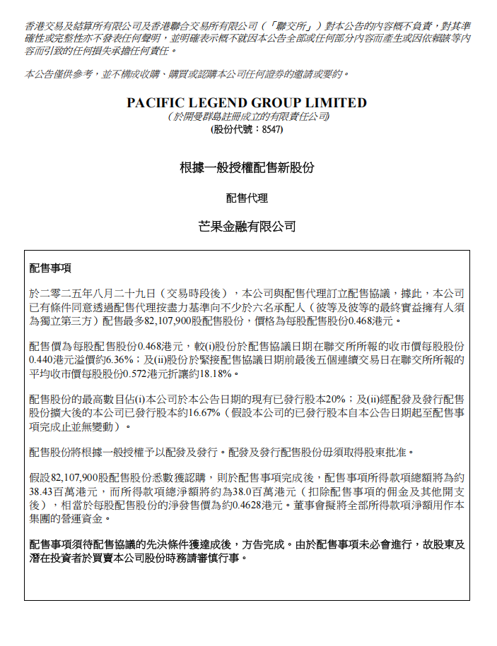 2025年8月29日,Pacific Legend Group(08547.HK)发布公告,拟通过配售代理配售最多 82,107,900 股股份,募集资金总额约 3843 万港元,扣除相关费用后,净筹资金约 3800 万港元。本次交易由芒果金融有限公司担任独家配售代理(承销)。 本次配售股份价格为 0.468 港元,较前一交易日收市价 0.44 港元溢价约 6.4%,配售股份占现有已发行股本约 20.0%,完成后占扩大股本约 16.7%。 Pacific Legend Group 作为香港知名家具及家居配饰品牌,业务涵盖零售、租赁、项目及酒店服务。本次融资所得款项将主要用于补充集团营运资金,进一步优化业务发展。 作为香港历史最悠久的本土综合类国际券商之一,芒果金融有限公司将依托全牌照优势,凭借专业的服务能力和深厚的市场经验,高效推进本次配售工作,助力企业实现资本运作目标。 |